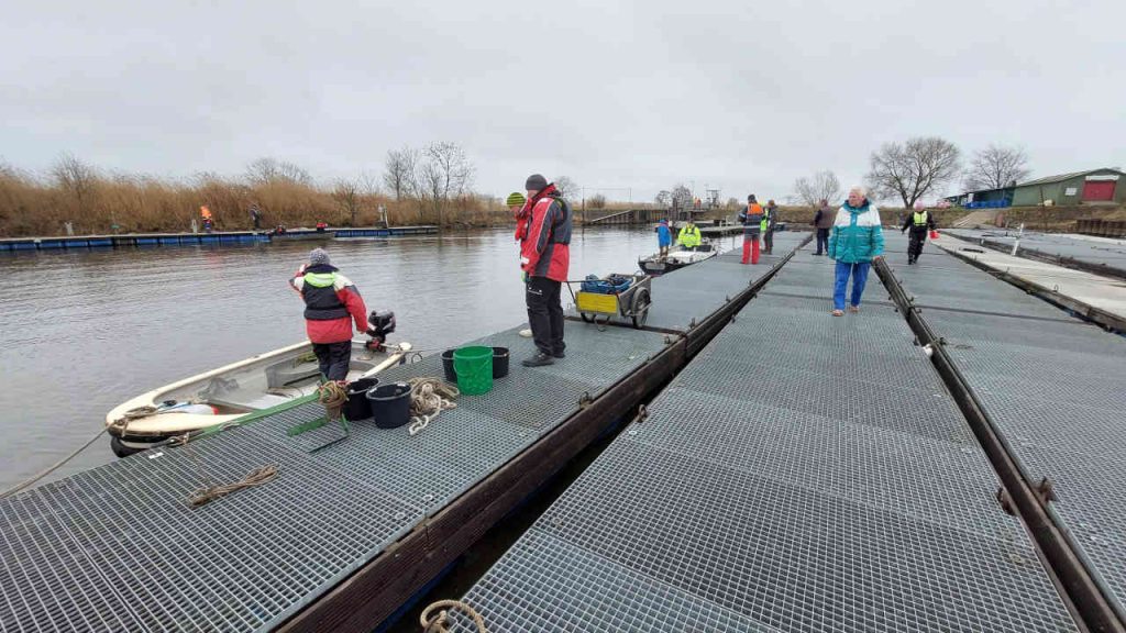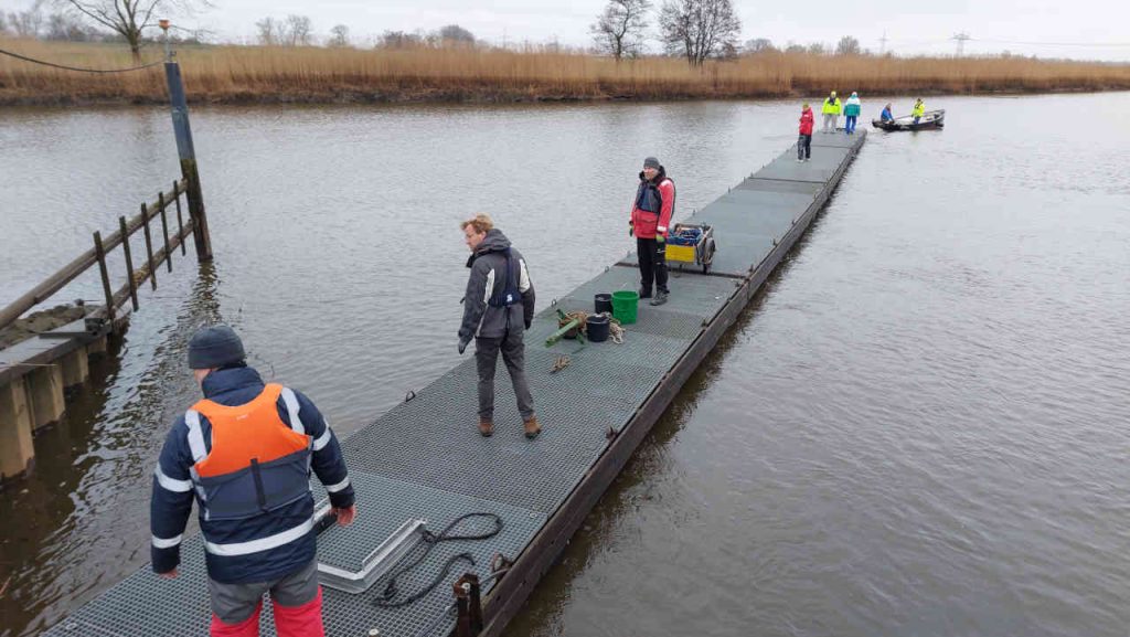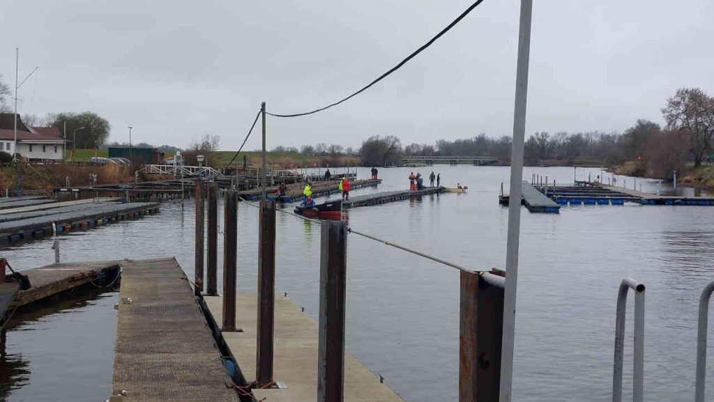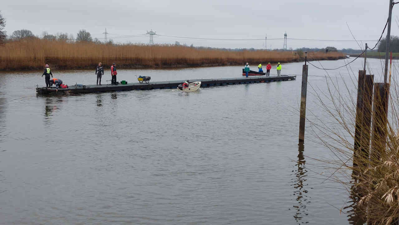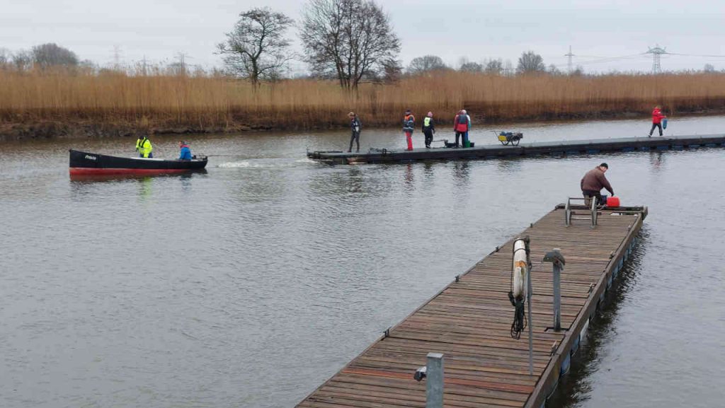 Die Stege kommen also, wie jedes Jahr, vom strömungsfreien Altarm, wo sie nicht durch Eis gefährdet werden können, in den Durchstich.