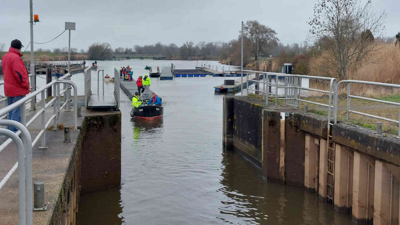 Wie man leicht sieht, passen die Stegabschnitte nur durch die Schleuse, wenn beide Tore offen stehen. Was natürlich bedeutet, dass gleicher Wasserstand zwischen Altarm und Ochtum hergestellt werden muss. Was wiederum bedeutet, dass sich die Vereine, das NLWKN und der Mond aufeinander abstimmen müssen.